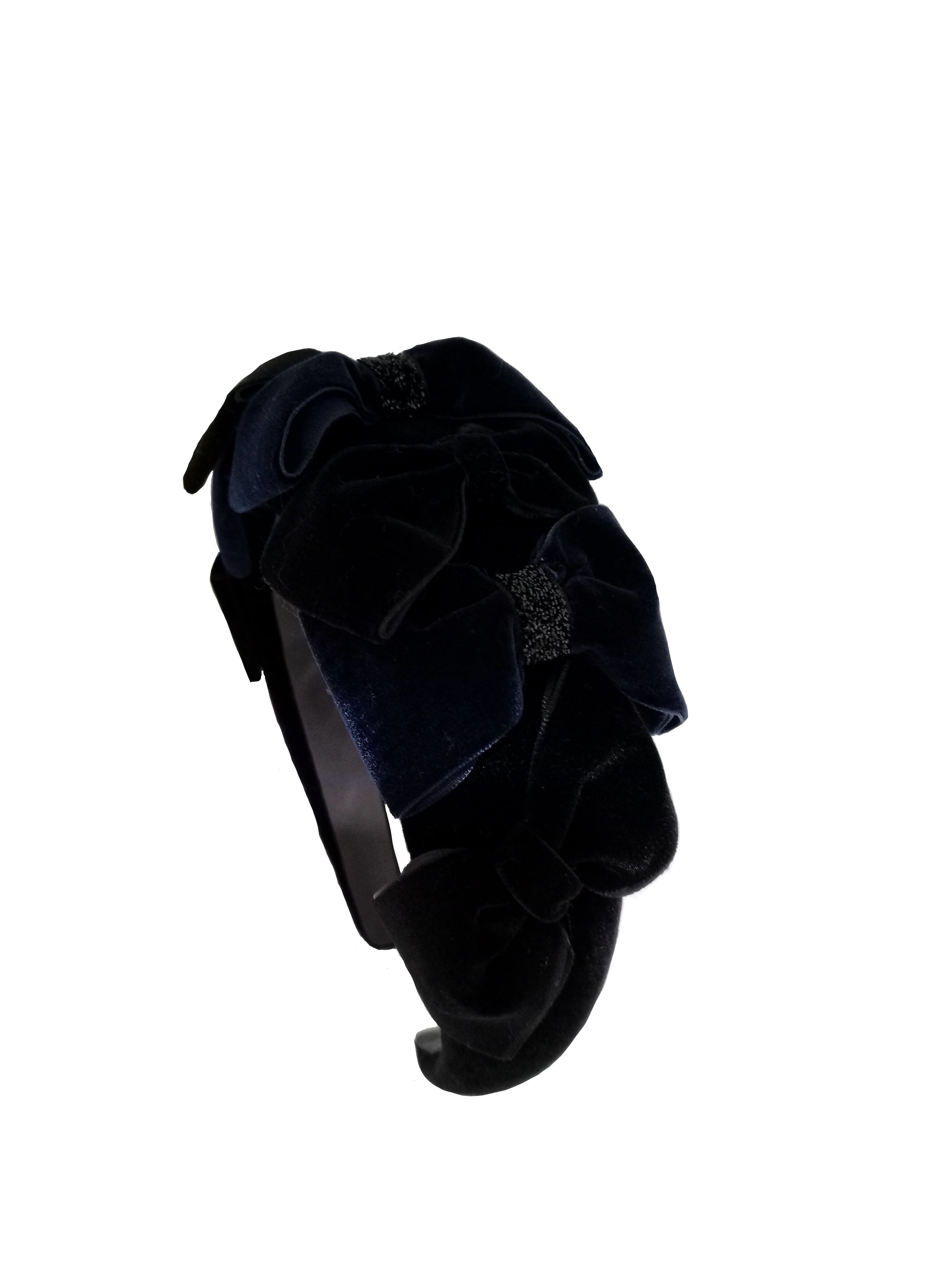 Diadema embellecida con una aplicación de lazos de terciopelo negro y azul sobre un tejido de terciopelo negro