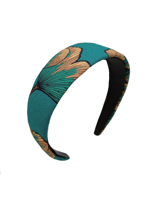 Diadema confeccionada con un tejido de algodón de color verde esmeralda intenso, estampado con hojas y flores