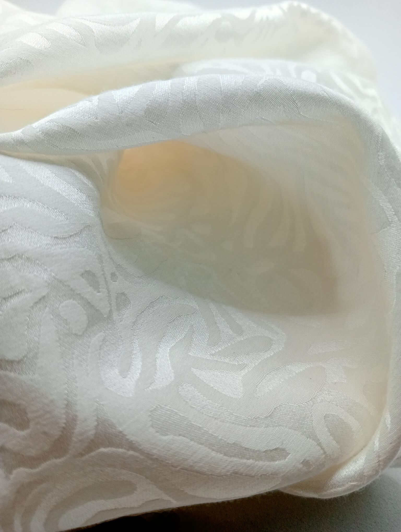 Pañuelo de color blanco, confeccionado con una tela de algodón y seda pura, tejido con un diseño que imita las rayas de la cebra. Sus dimensiones son de 48 cm de ancho por 134 cm de largo, aproximadamente, y está rematado con un dobladillo enrollado a mano con hilo de seda de color blanco. Es un tejido suave, fluido, brillante y ligeramente transparente.