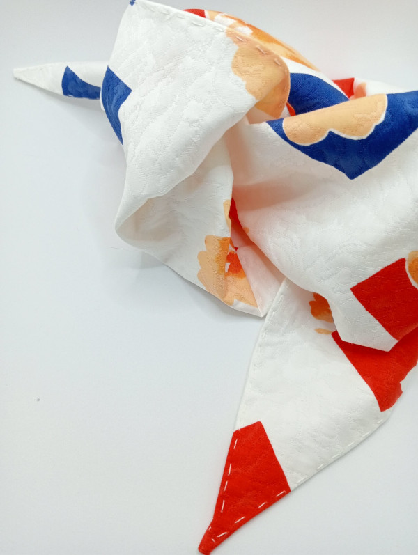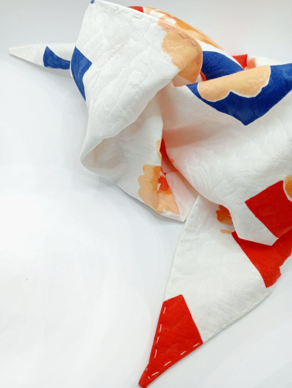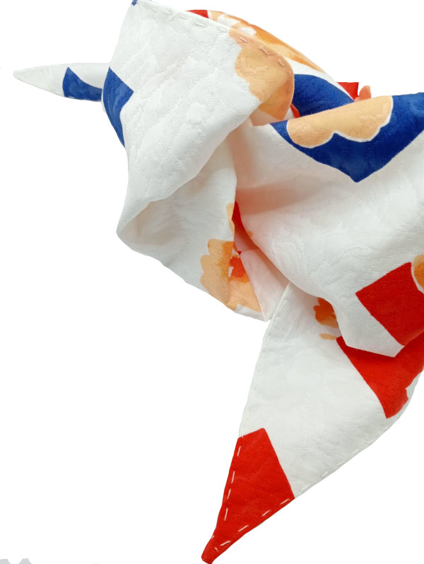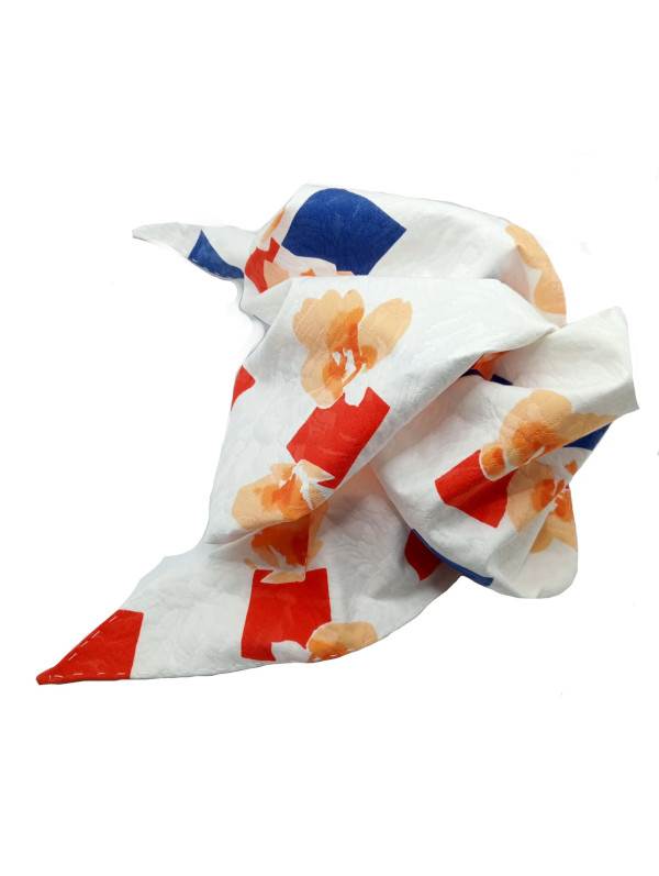 Tela de origen francés elaborada con un jacquard de flores y figuras geométricas de color naranja, azul marino y rojo, diseño tÃpico de la Casa d’Este inspirado en los años 40, en un piqué de algodón puro mercerizado. El pañuelo tiene la forma de un rombo esbelto, cuya diagonal de mayor longitud mide 106 cm y, la de menor, 34 cm. Está rematado con un dobladillo enrollado a mano con hilo de seda blanco.