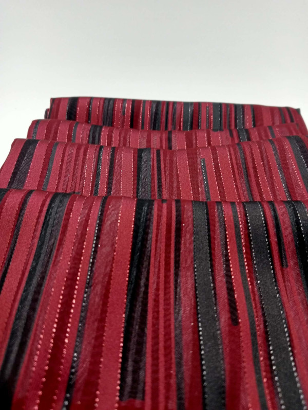 Pañuelo grande de 108 por 140 centĂmetros, confeccionado con una tela crĂªpe Georgette de seda pura con un diseño de rayas de distintos tonos de fucsia y violeta, fluido y semitransparente, pero con gran peso y personalidad, y rematado con un dobladillo enrollado a mano con hilo de seda de color granate.