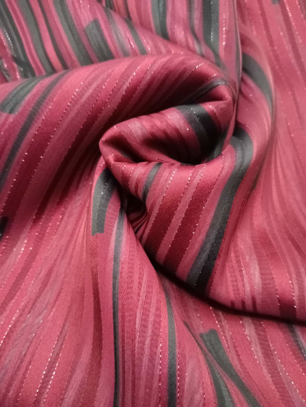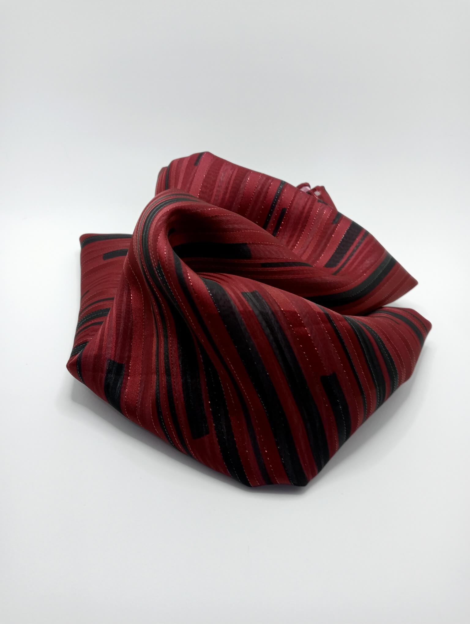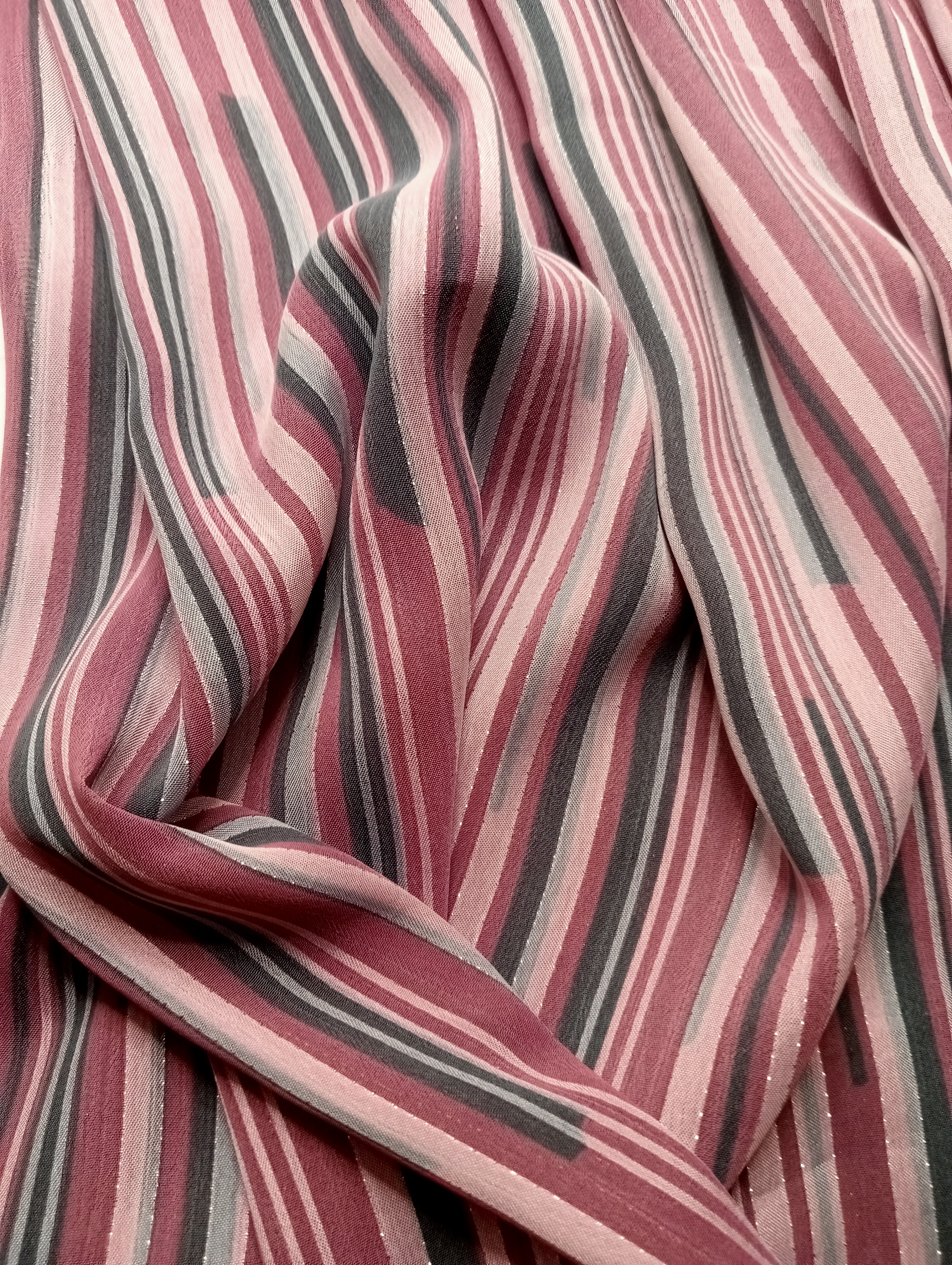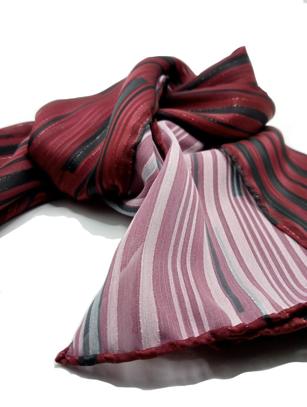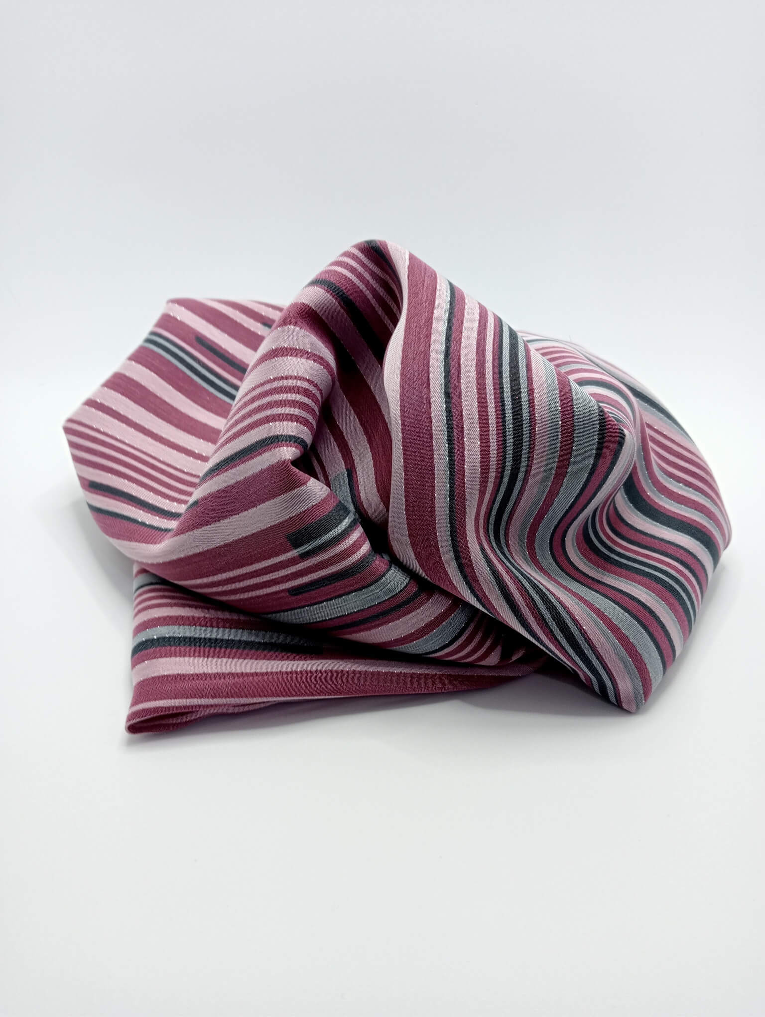 Pañuelo elaborado con una tela georgette de seda, estampada con un diseño reversible de rayas con distintos tonos de fucsia y violeta