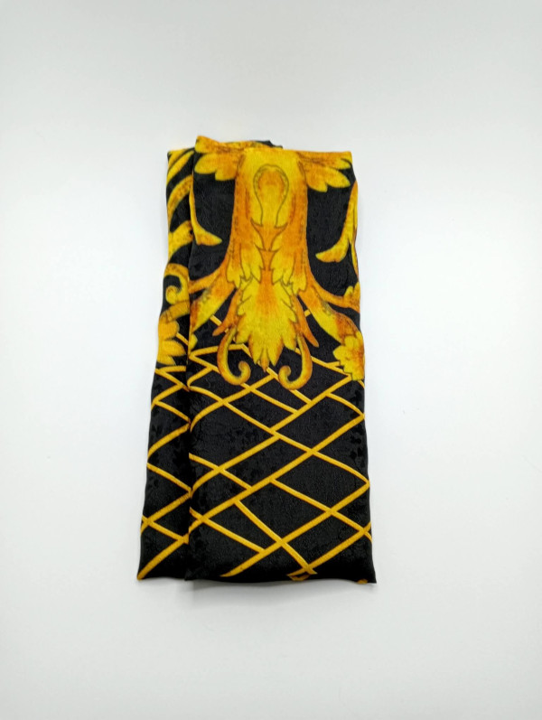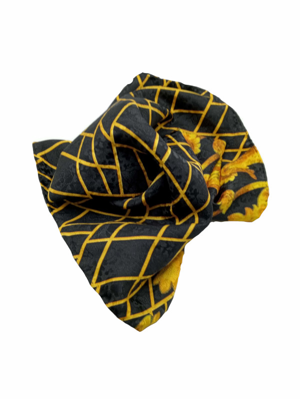 Pañuelo elaborado con una tela de seda pura italiana de color negro, del diseñador italiano Claudio Fioretti, estampada con un jacquard geomĂ©trico rematado con una flor de lis de color amarillo oro en uno de los lados. Tiene unas dimensiones de 34 cm de ancho por 136 cm de largo aproximadamente, y estĂ¡ rematado con un dobladillo enrollado a mano con hilo de seda de color negro.