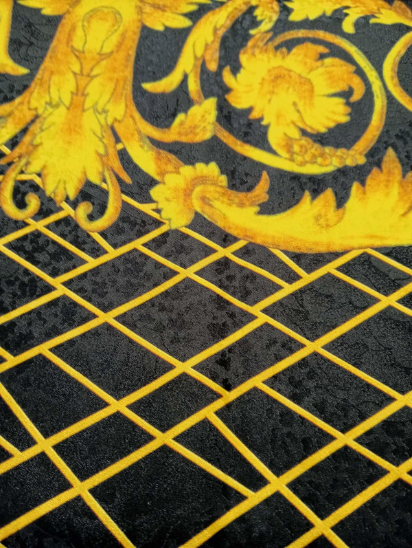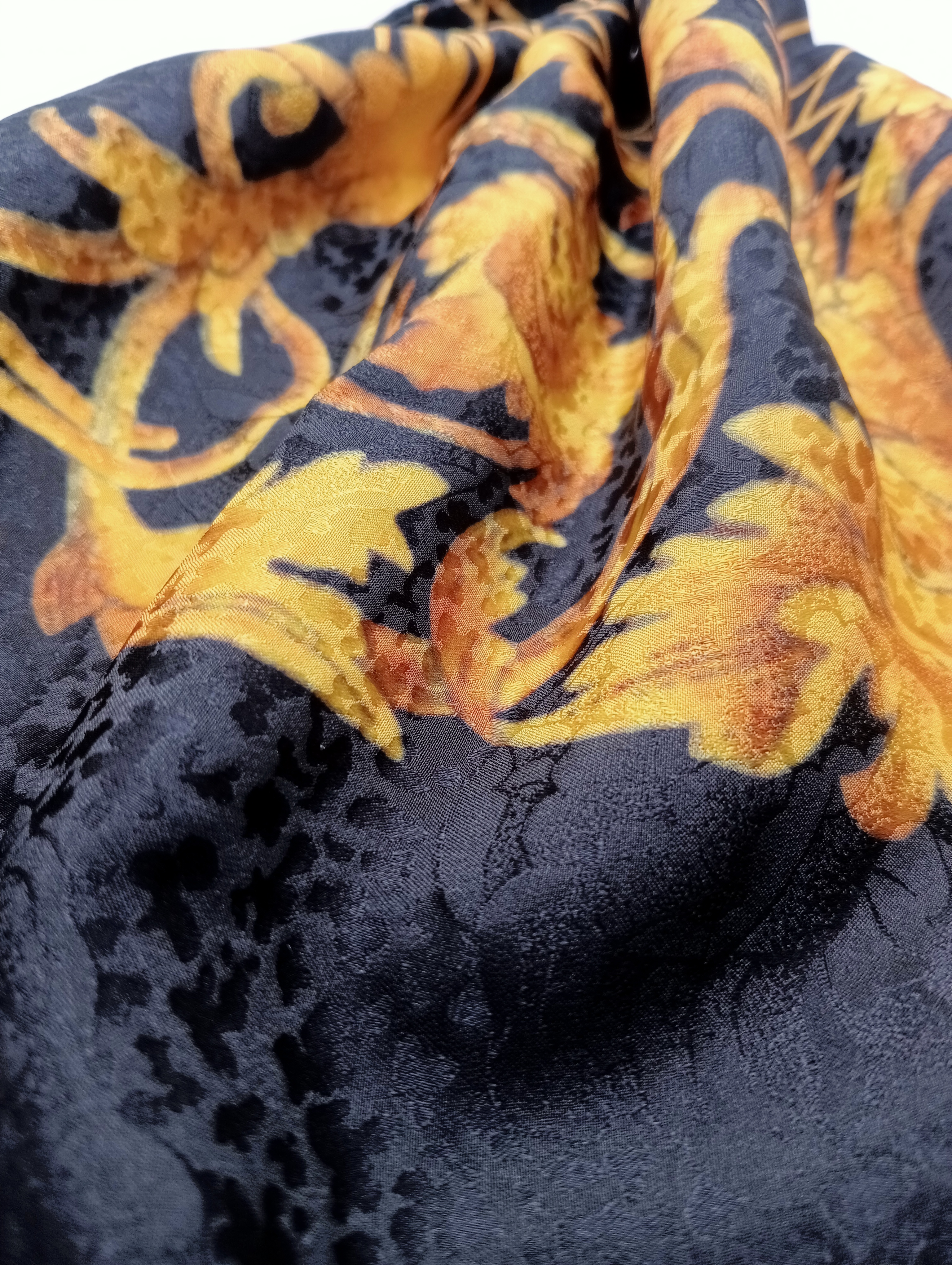 Seda pura italiana de color negro, estampada con un jacquard geométrico rematado con una flor de lis de color amarillo oro en uno de los lados