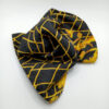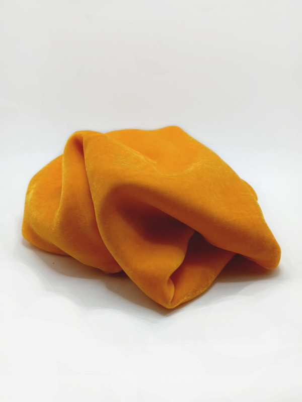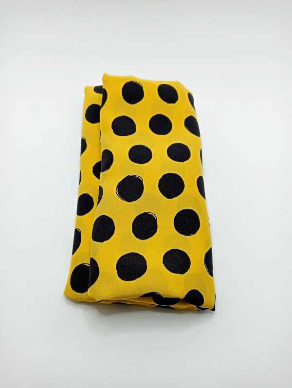 Pañuelo elaborado con una tela de seda pura italiana estampada con lunares de color negro azabache sobre un fondo de color amarillo intenso, del diseñador italiano Claudio Fioretti, rematado con un dobladillo enrollado a mano con hilo de seda de color amarillo. Sus dimensiones son de 30 cm de ancho por 136 cm de largo.