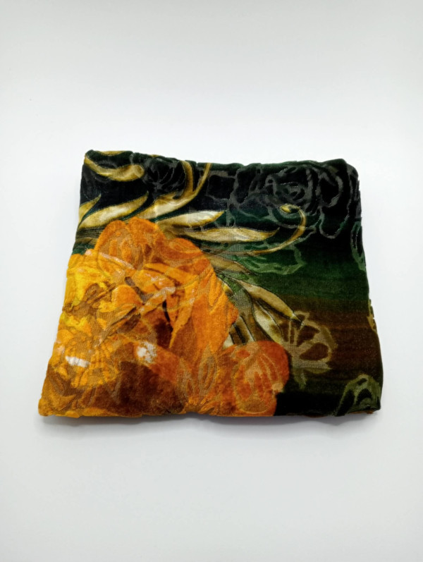 Pañuelo elaborado con una tela italiana de terciopelo corto devoré, adornado con un estampado floral en colores verde y amarillo mostaza intensos. Es un pañuelo muy cálido, liviano y suave, con forma rectangular, de 120 cm de largo por 34 cm de ancho, y está rematado con un dobladillo enrollado a mano con hilo de seda de color verde esmeralda.