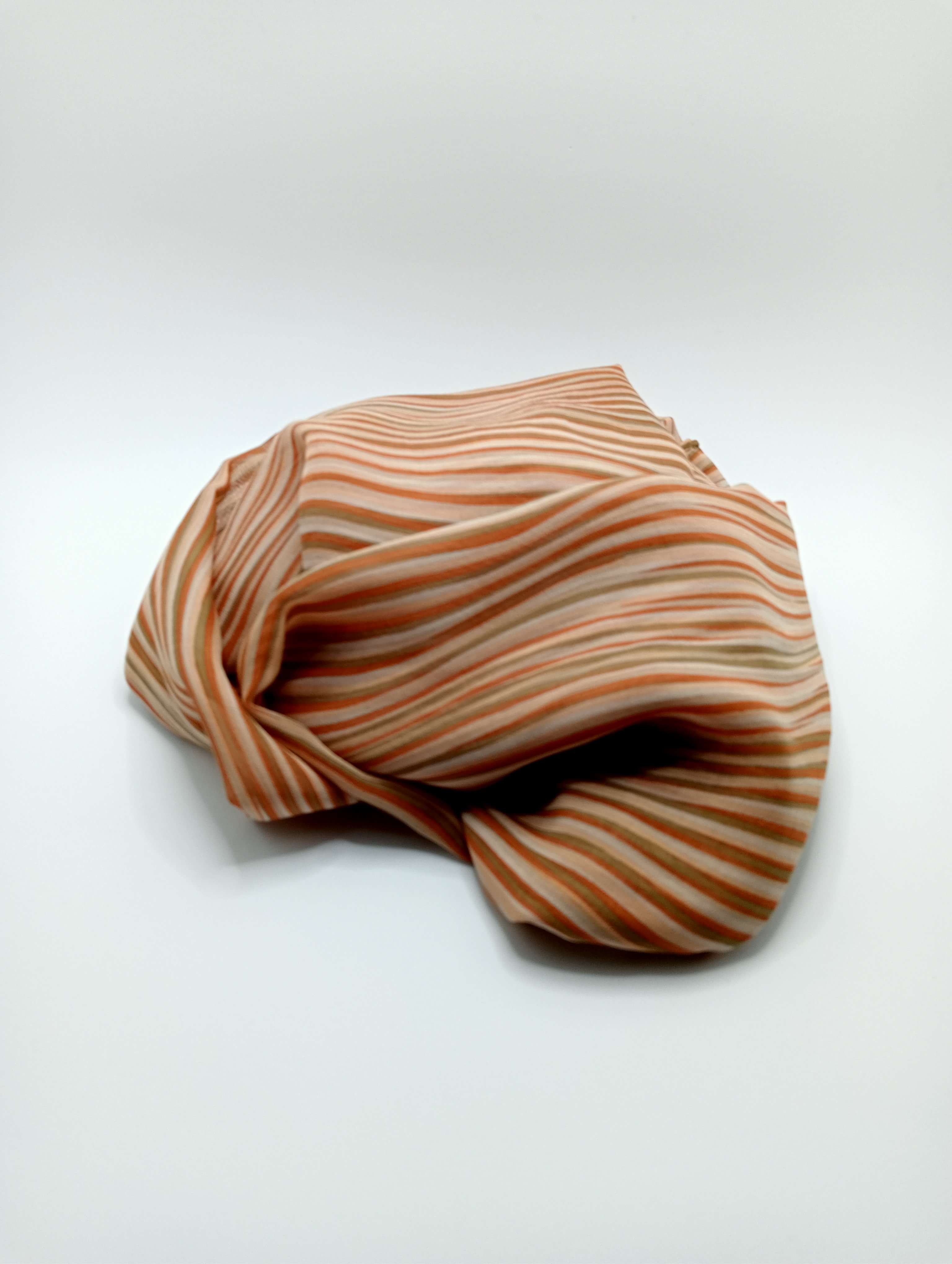 Pañuelo elaborado con una tela georgette de seda pura italiana, estampada con unas bonitas ondas de color beige, marrón intenso y verde caqui. El pañuelo, suave, transparente y muy ligero, mide 40 cm de ancho por 140 cm de largo, y está rematado con un dobladillo enrollado a mano con hilo de seda de color beige.