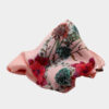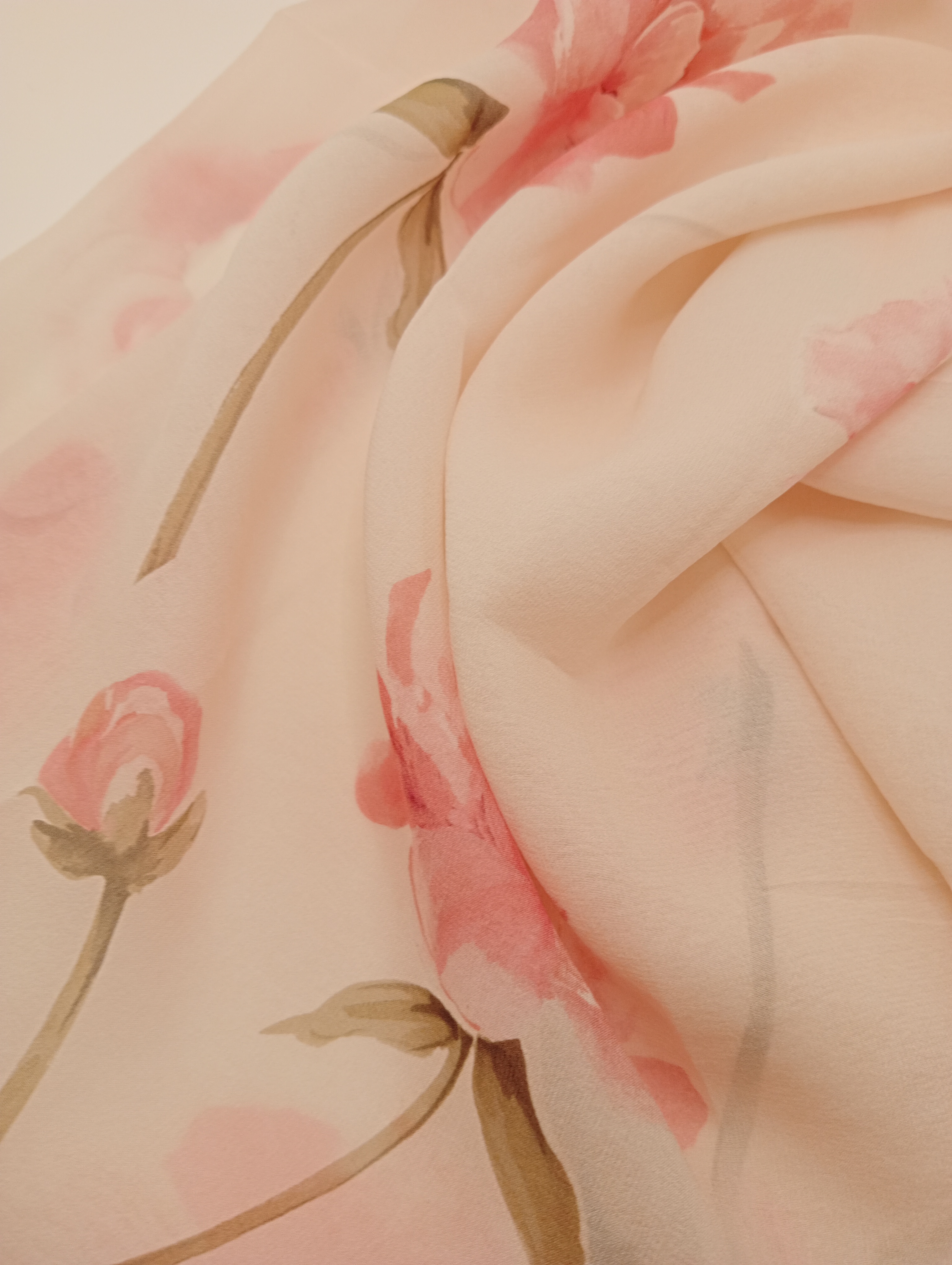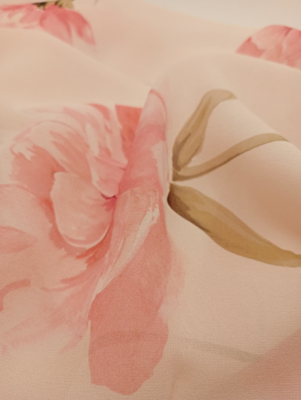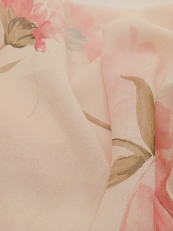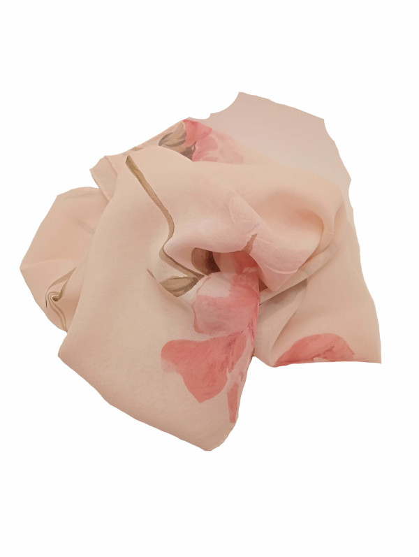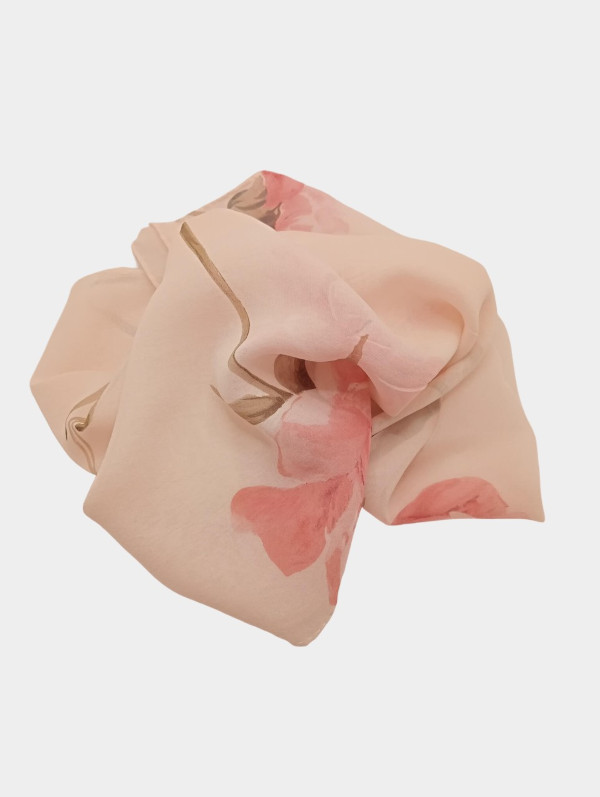 Pañuelo elaborado con una tela georgette de seda pura de color rosa pastel, estampada con flores de color rosa caramelo y hojas verdes