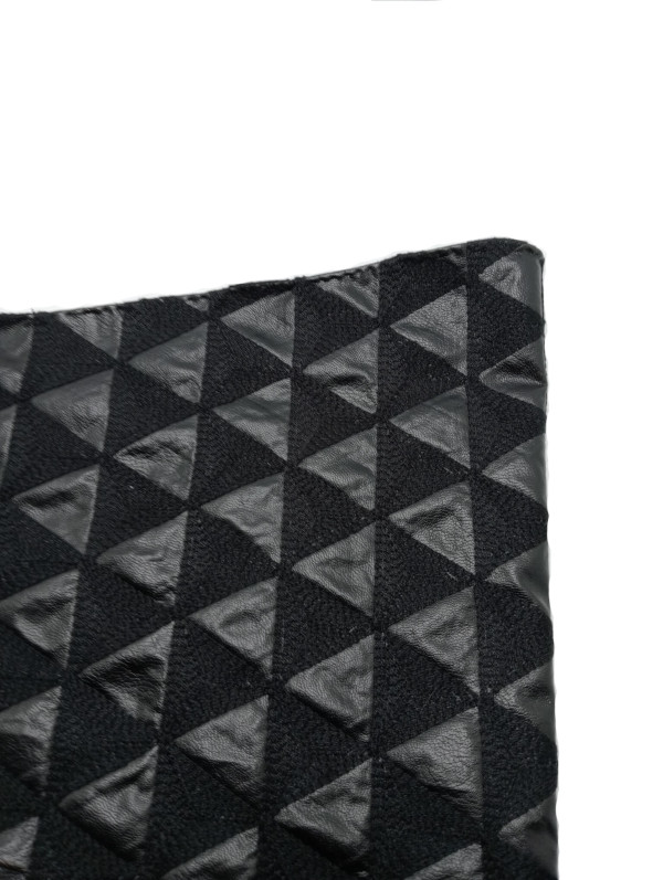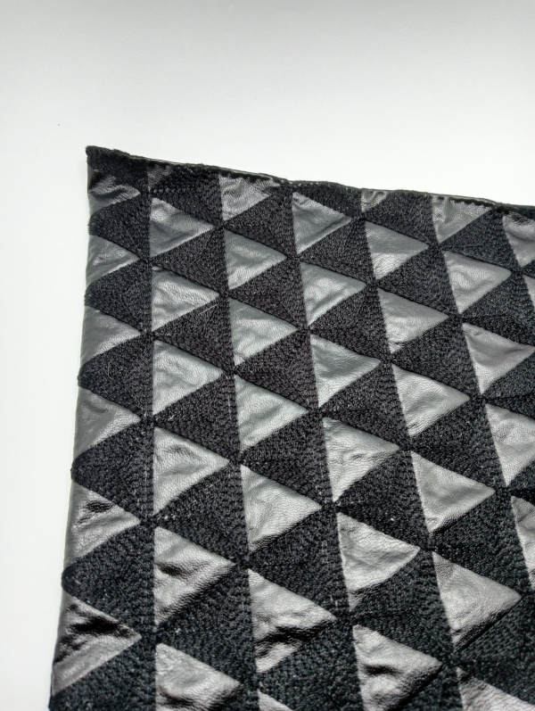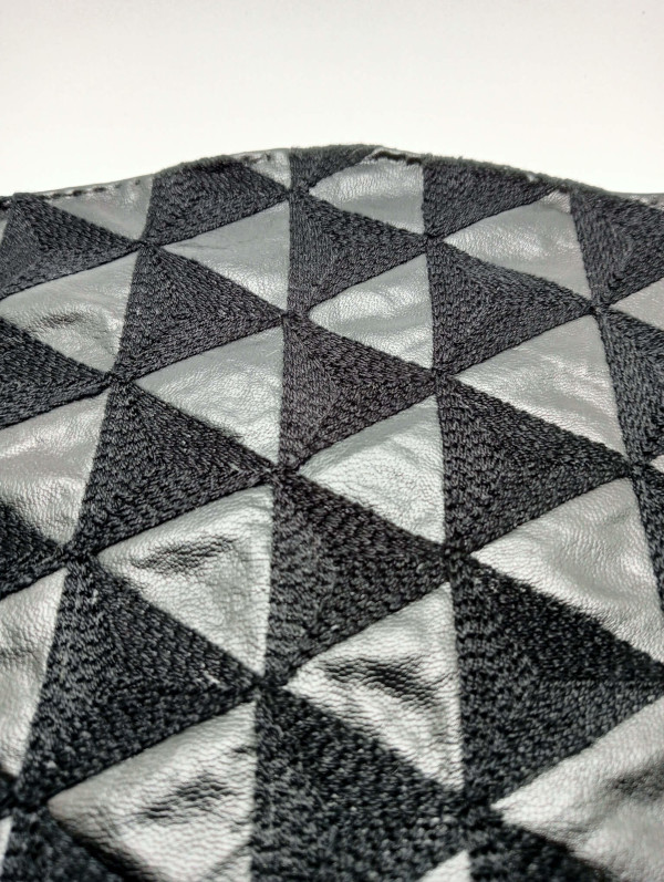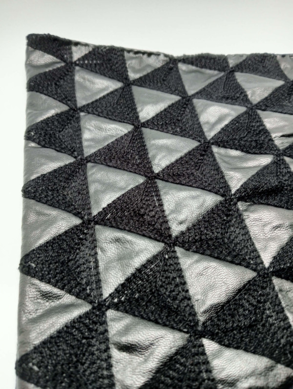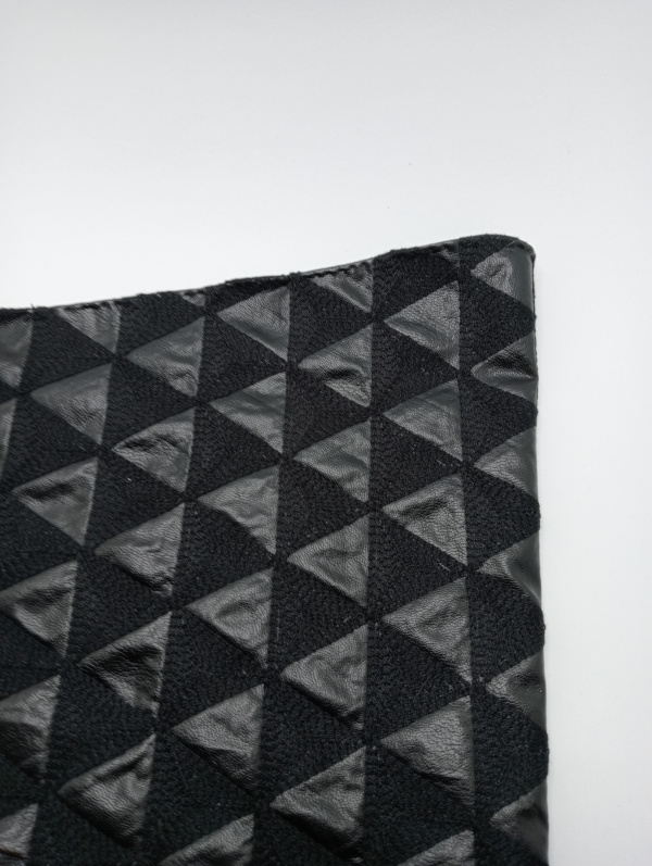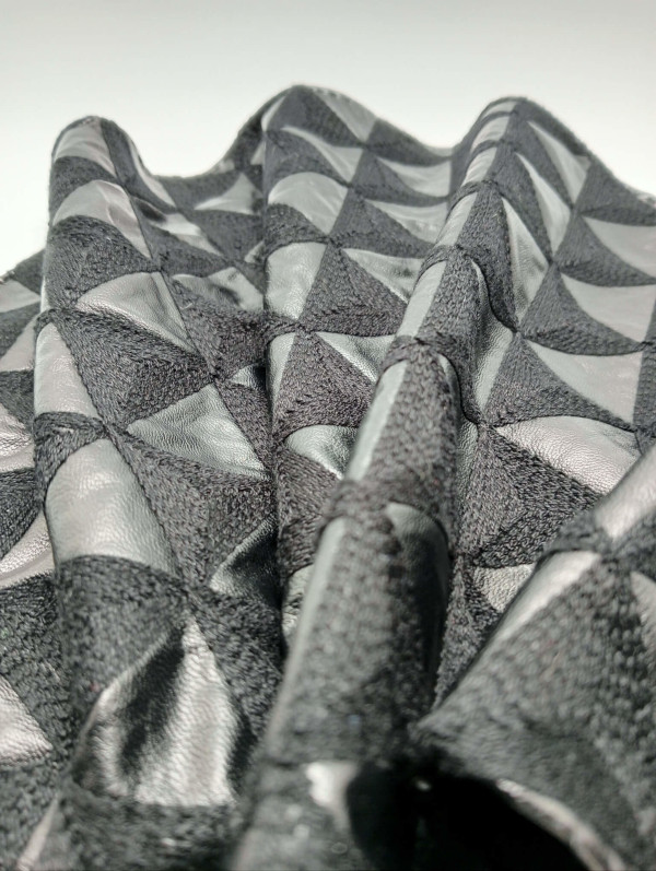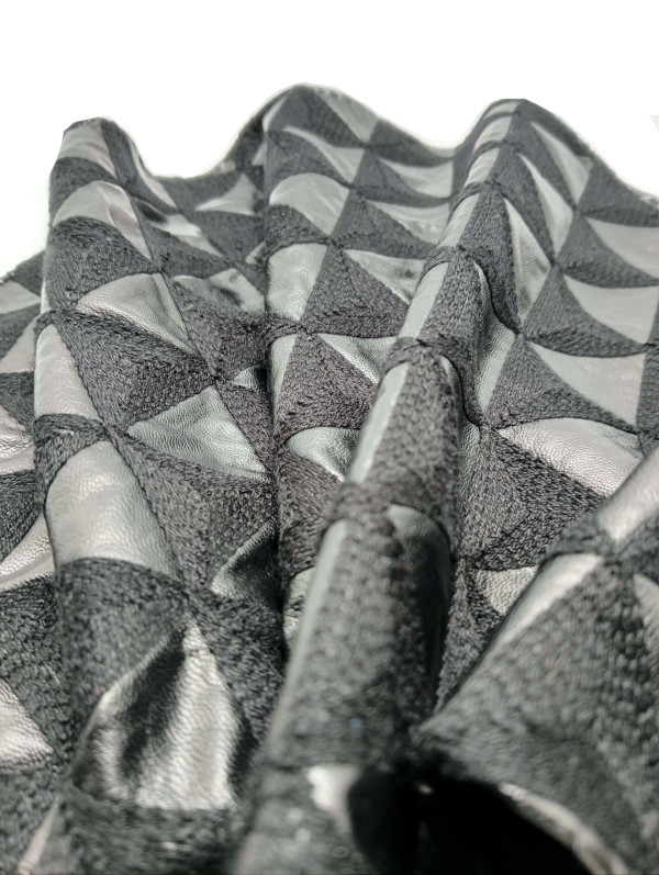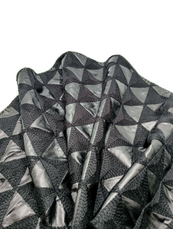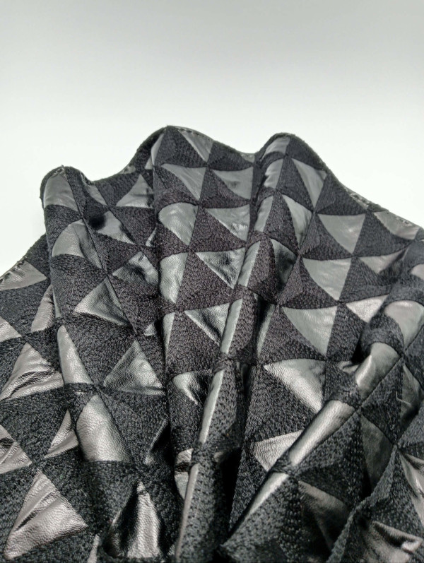 Pañuelo elaborado con un tejido de poliéster muy similar al cuero auténtico, con un diseño de figuras triangulares, flexible, y con un tacto pesado y suave a la vez. El pañuelo tiene la forma de un rombo esbelto, cuya diagonal de mayor longitud mide 136 cm, aproximadamente, y la de menor 28 cm, y está rematado con un dobladillo enrollado a mano con hilo de seda negro.