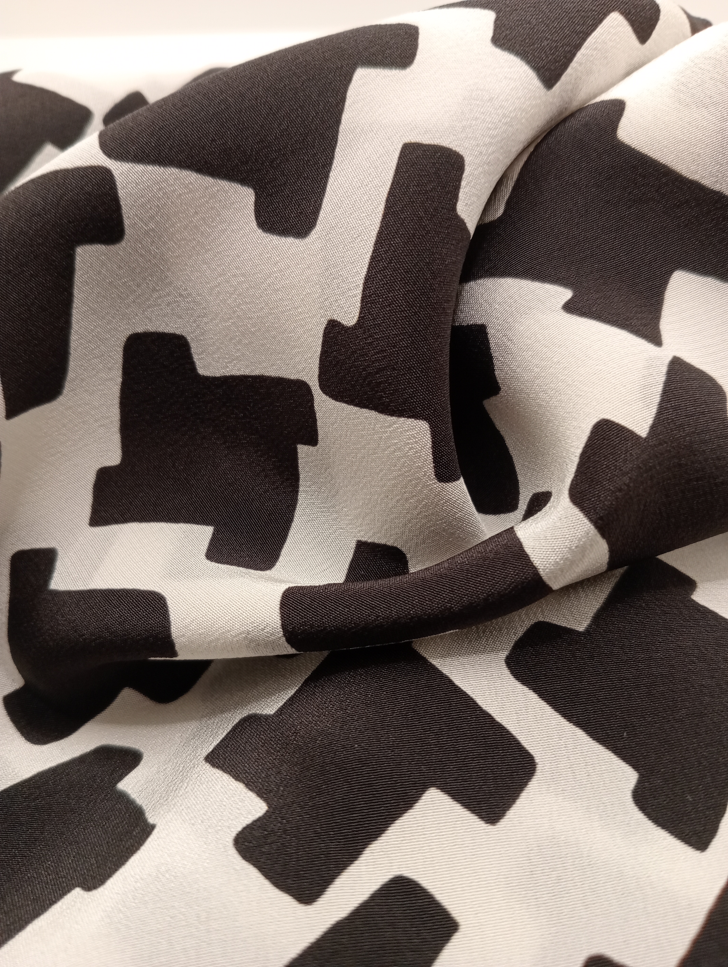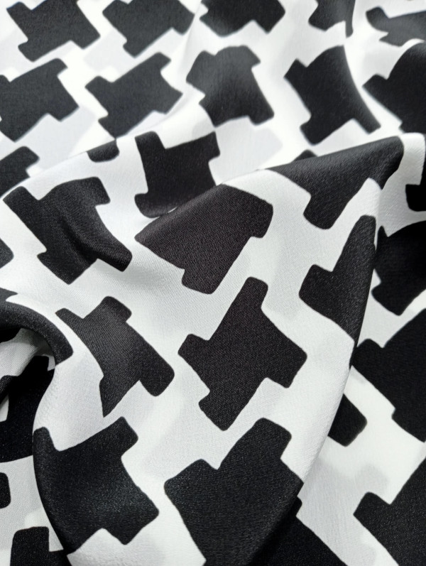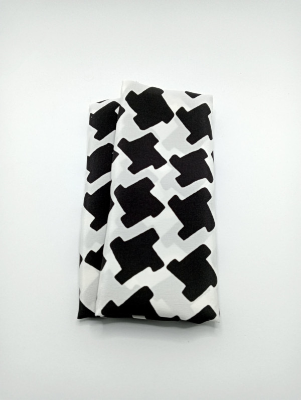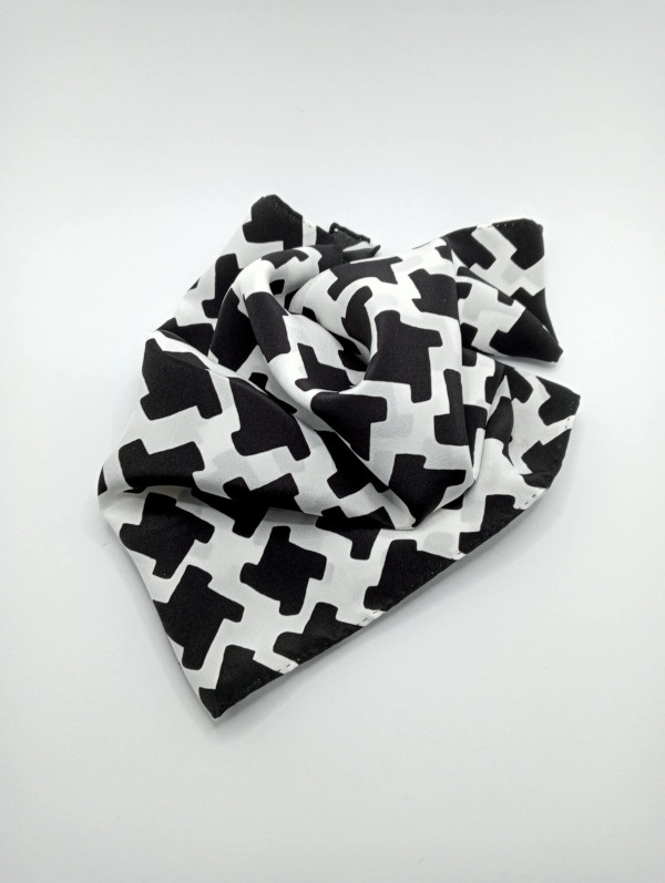 «Crepé de China» elaborado con una tela de seda pura italiana, estampada con un diseño de pata de gallo de color blanco y negro, del diseñador italiano Luca Martinelli. Tiene unas dimensiones de 30 cm de ancho por 134 cm de largo aproximadamente, y está rematado con un dobladillo enrollado a mano con hilo de seda de color negro.