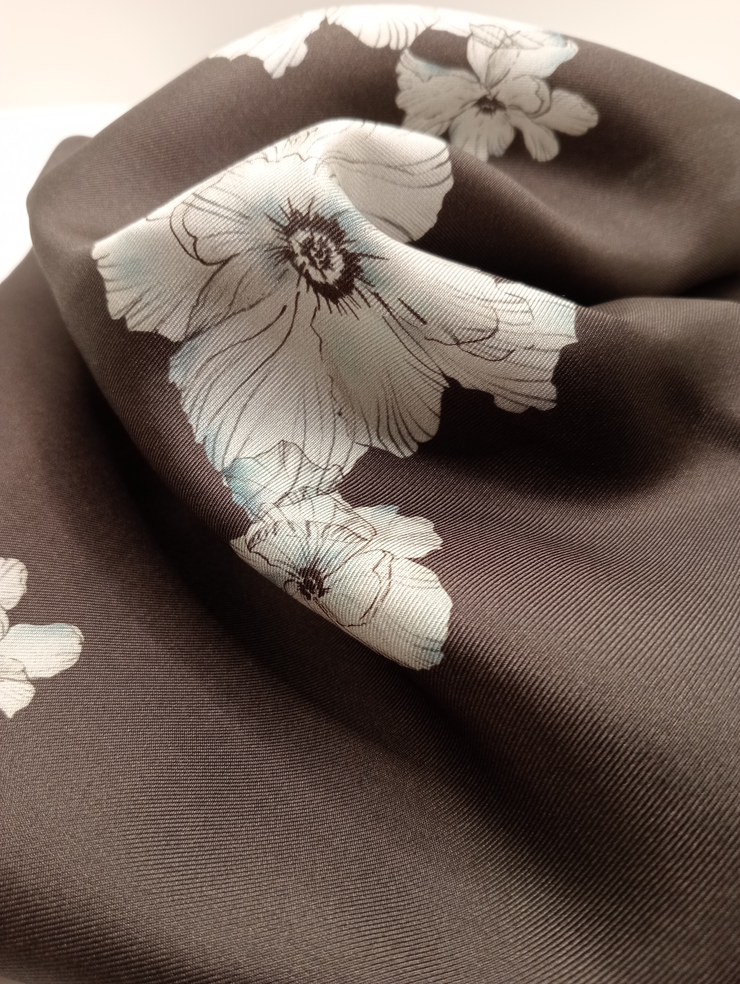 Sarga de seda pura italiana de color gris oscuro estampada con unas flores de color blanco y azul claro