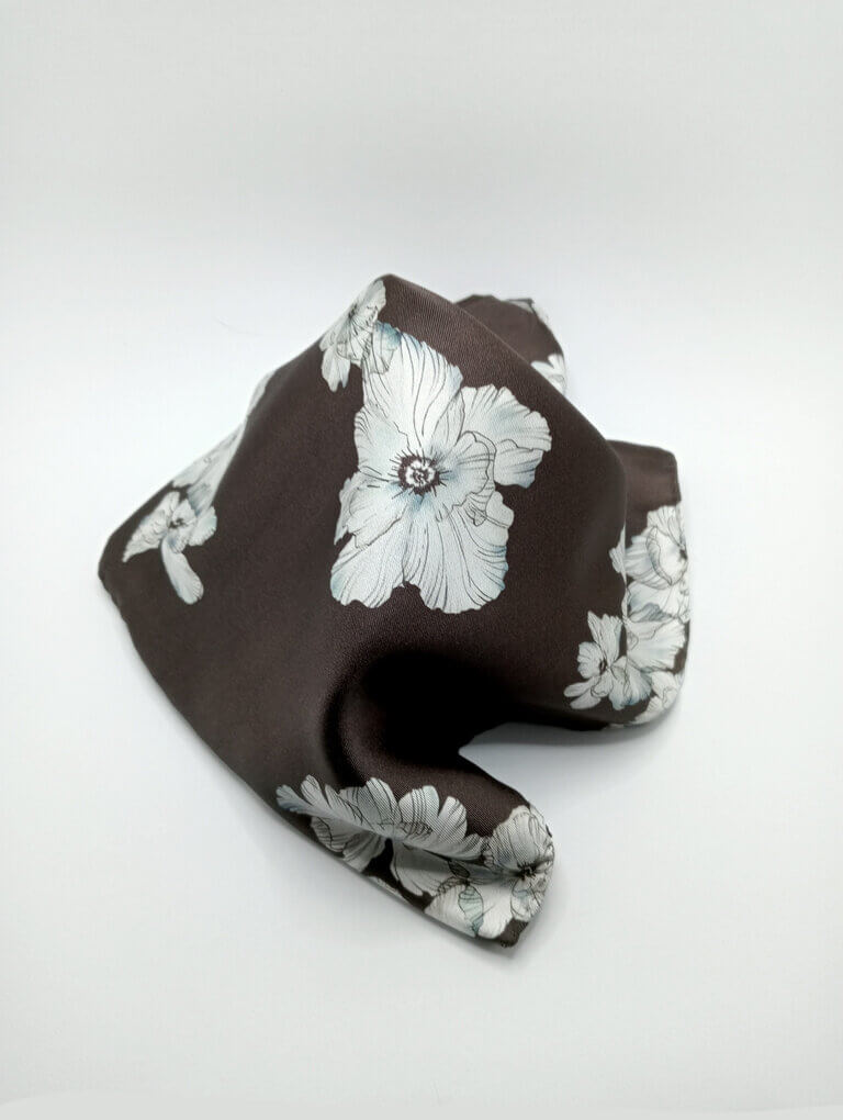 Elegante pañuelo de 36 cm de ancho por 136 cm de largo, elaborado con una sarga de seda pura italiana de color gris oscuro estampada con unas flores de color blanco y azul claro, y rematado con un dobladillo enrollado a mano con hilo de seda de color verde oliva.