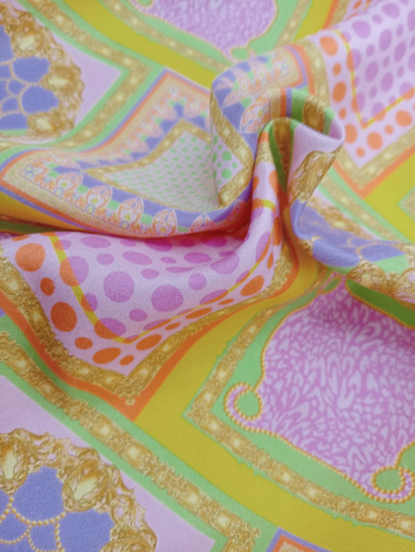 Pañuelo de seda pura shantung, estampado con distintas formas geométricas y lunares en colores pastel