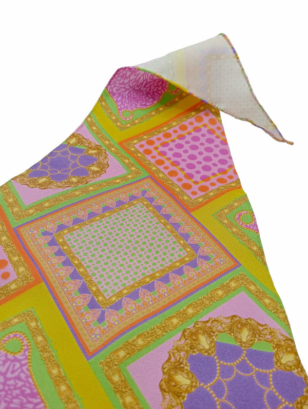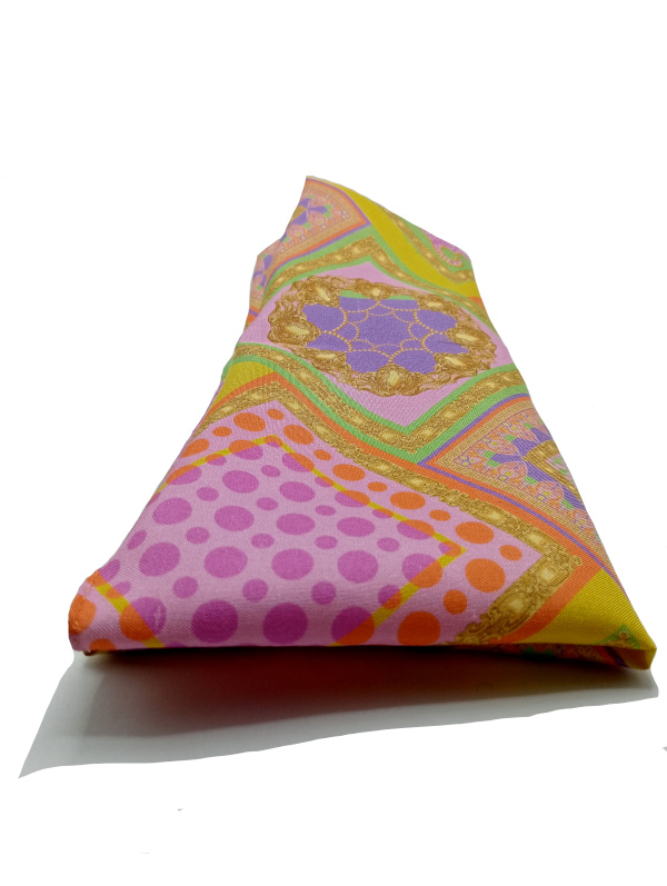 Elegante pañuelo confeccionado con una tela de seda shantung, estampada con distintas formas geométricas y lunares en colores pastel, y rematado con un dobladillo enrollado a mano con hilo de seda de color castaño claro. Se trata de una seda áspera y muy tupida, aunque extremadamente liviana, que forma la figura de un rombo esbelto, cuya diagonal de mayor longitud mide 130 cm, aproximadamente, y la de menor, 35 cm.