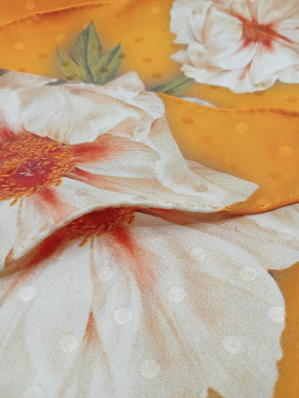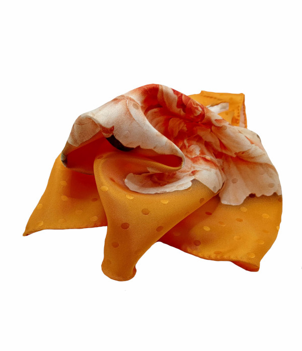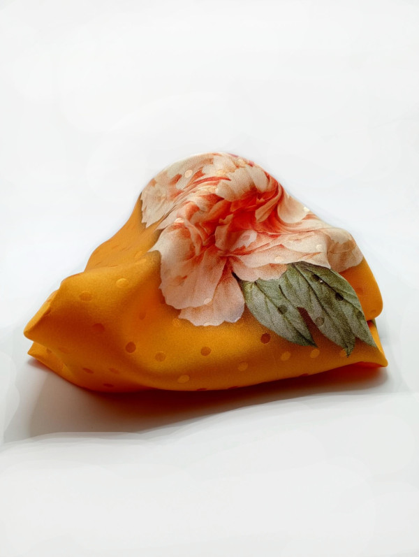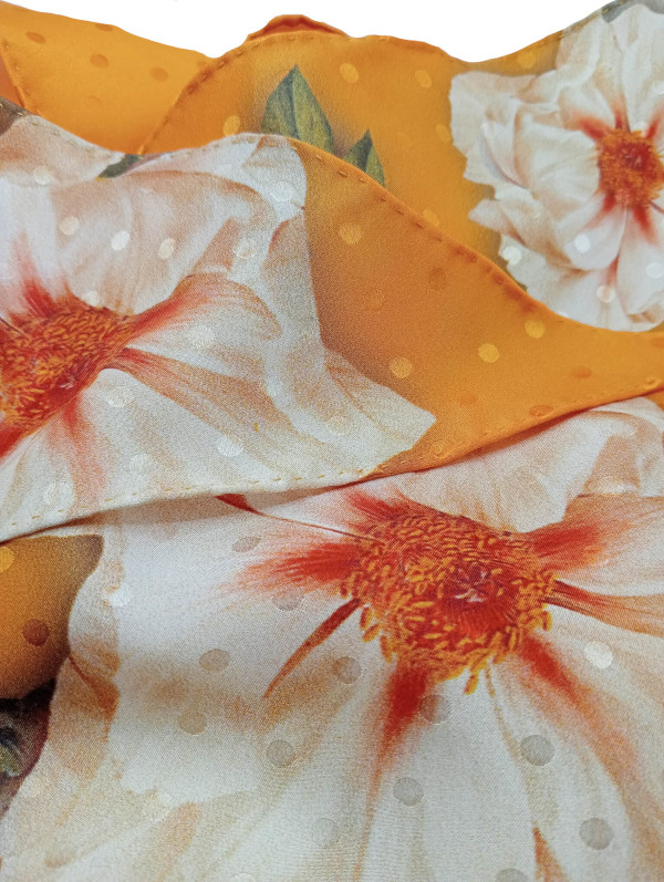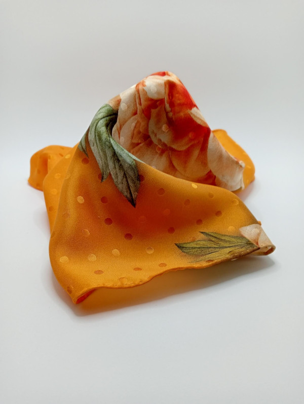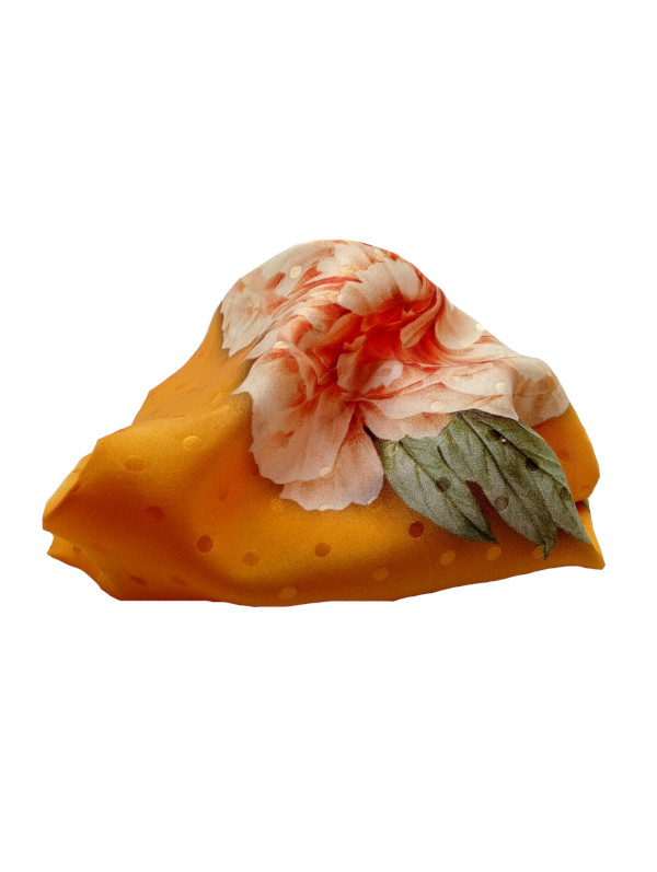 Pañuelo elaborado con una tela de seda pura italiana, estampada con un jacquard de flores y lunares sobre un fondo naranja pálido