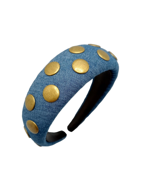 Diadema adornada con una aplicación de lunares de metal dorado sobre un tejido vaquero