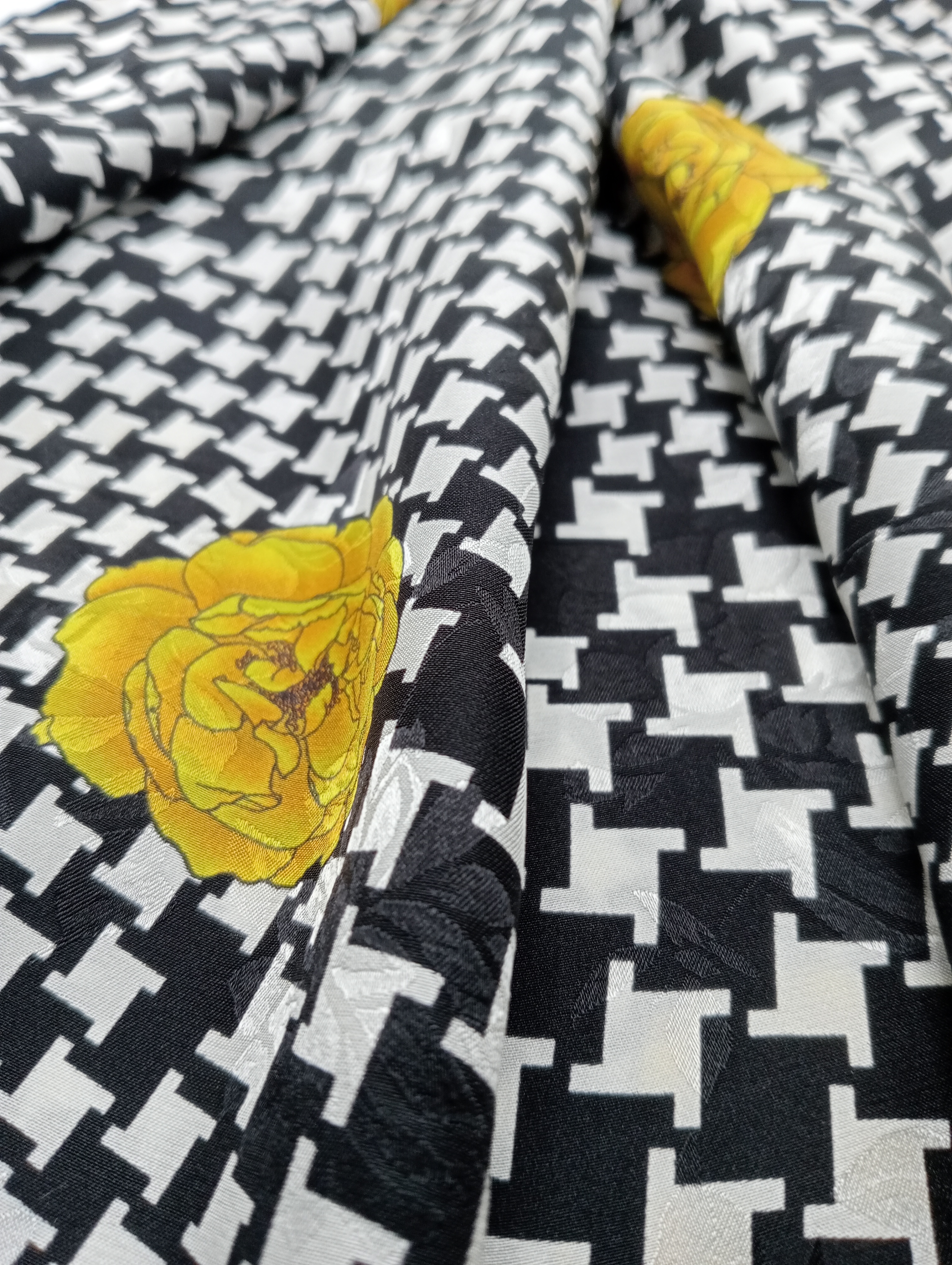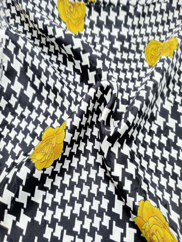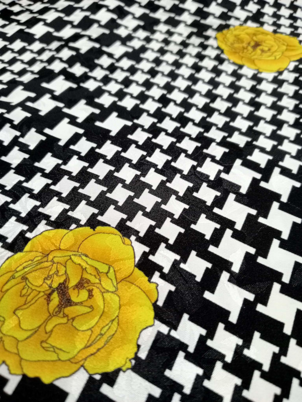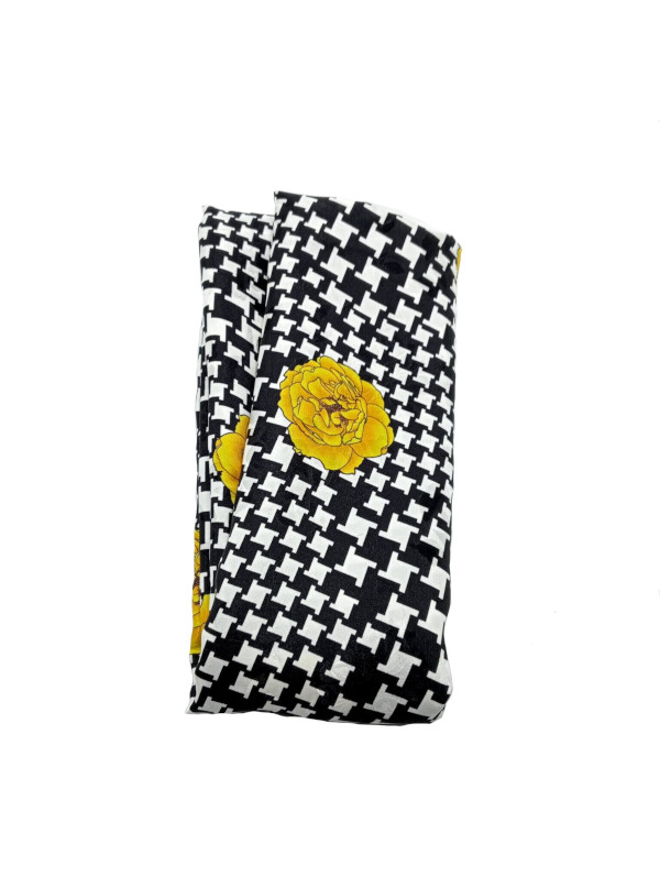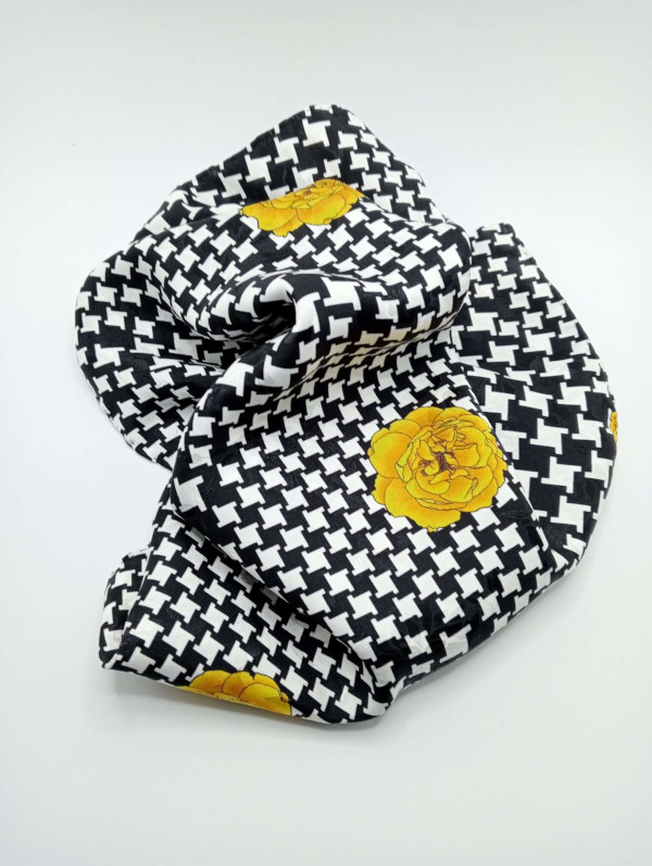 Pañuelo de lino puro italiano, estampado con unas flores amarillas sobre un patrón de pata de gallo blanco y negro