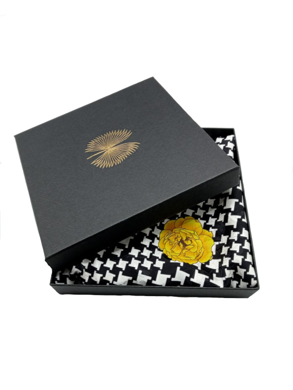 Pañuelo elaborado con una tela de lino puro italiano, del diseñador Claudio Fioretti, estampado con unas preciosas flores de color amarillo brillante sobre un patrón de pata de gallo blanco y negro, y rematado con un dobladillo enrollado a mano con hilo de seda de color negro. Tiene unas dimensiones de 36 cm de ancho por 136 cm de largo.