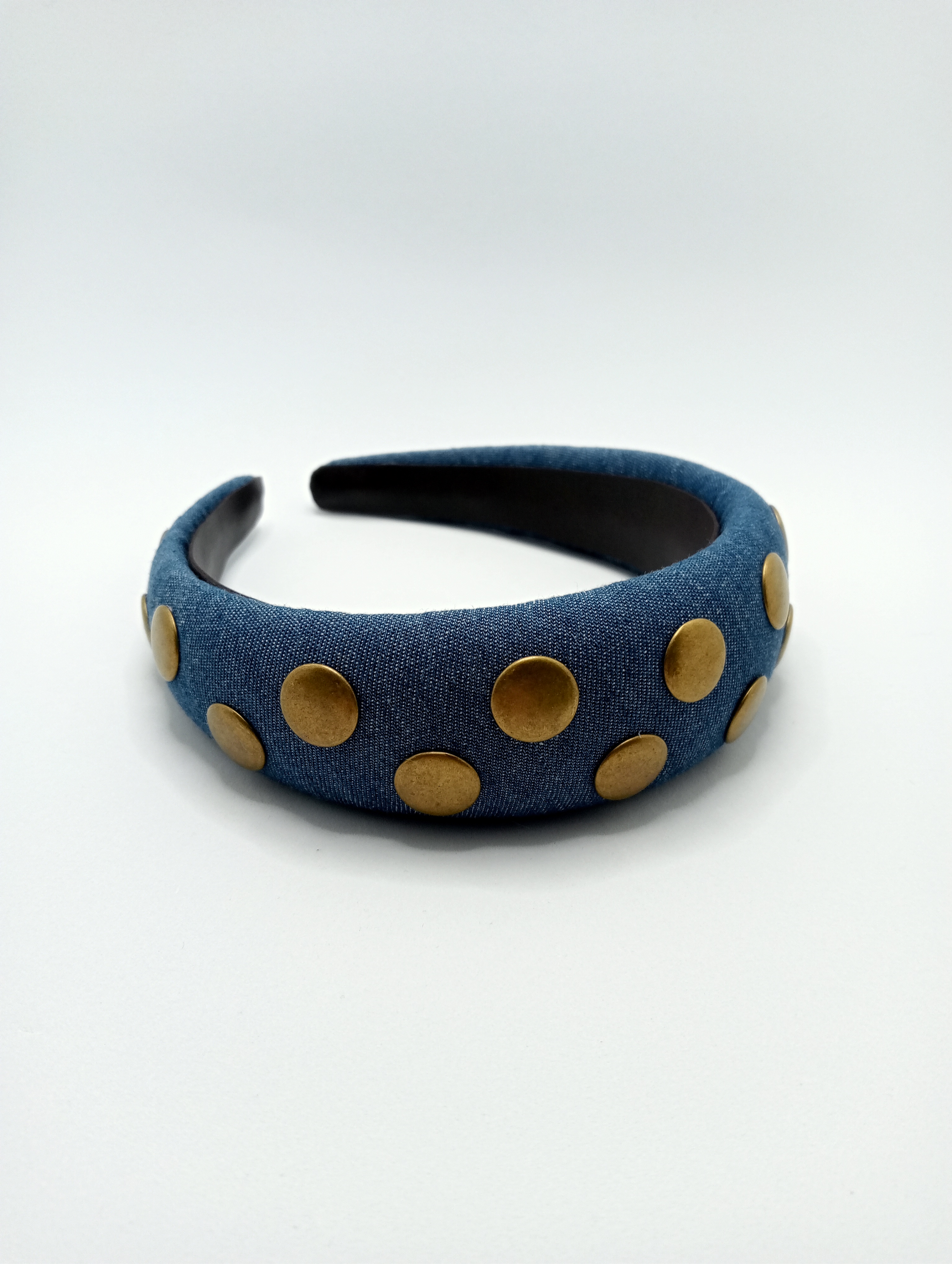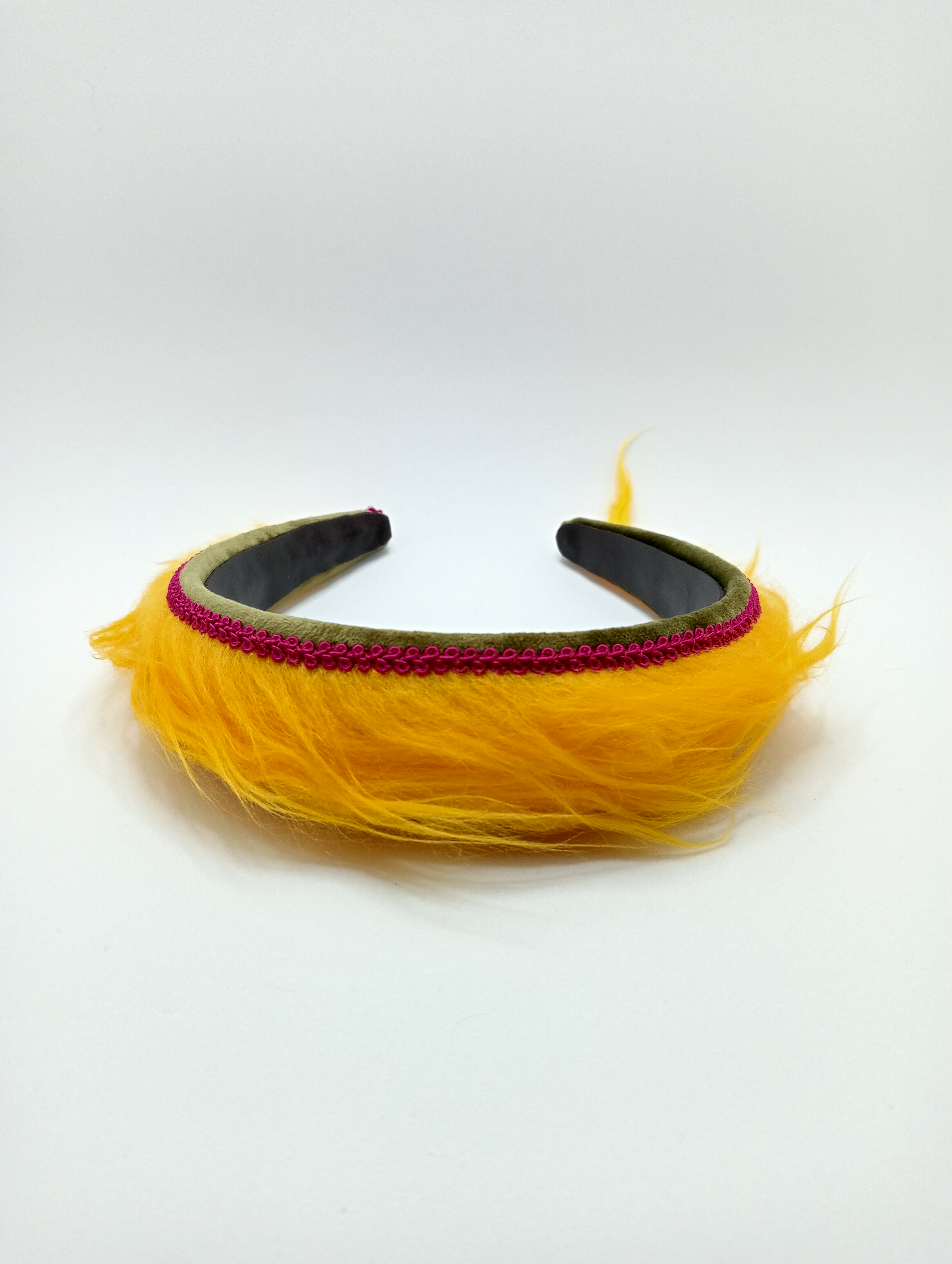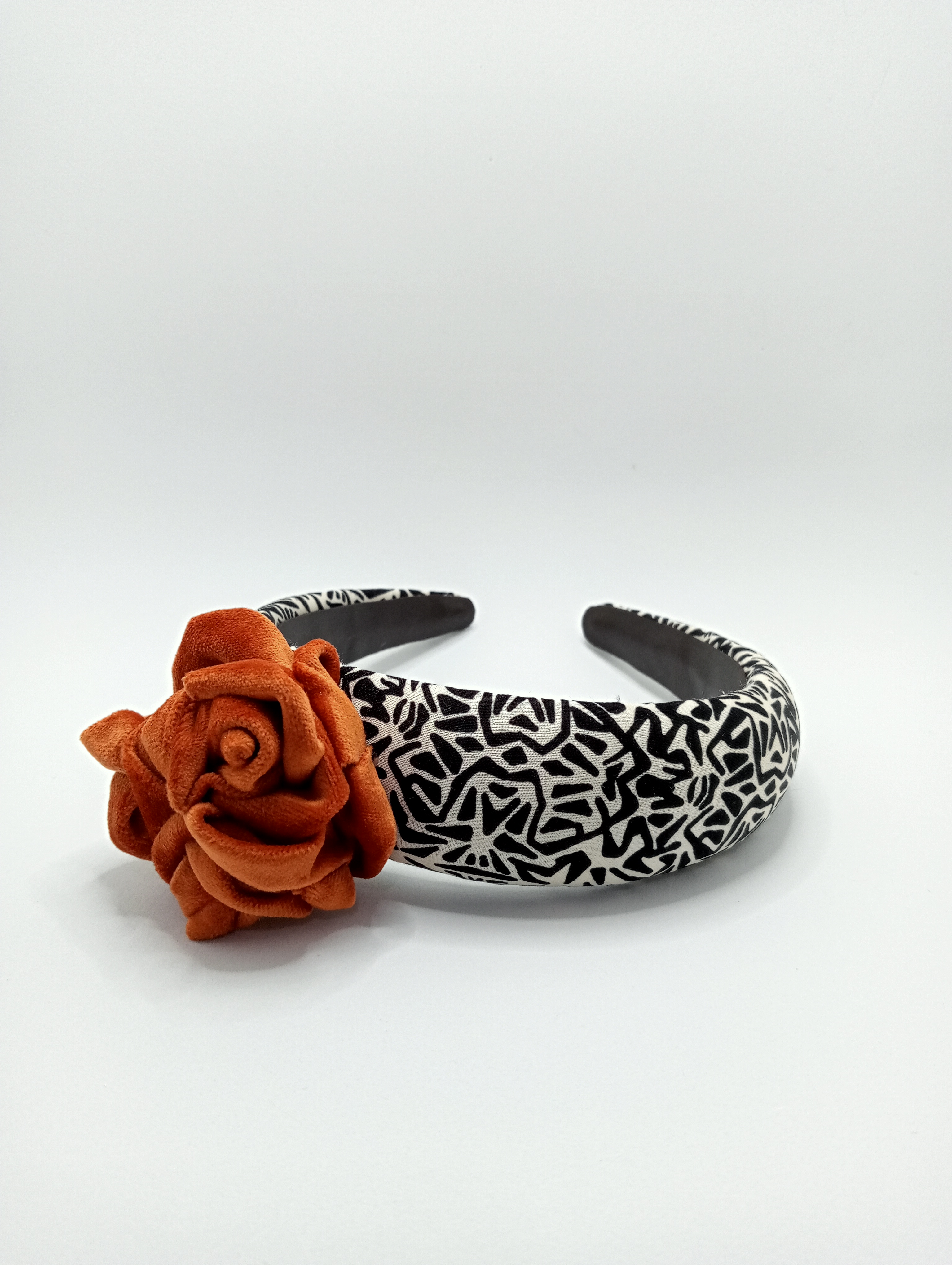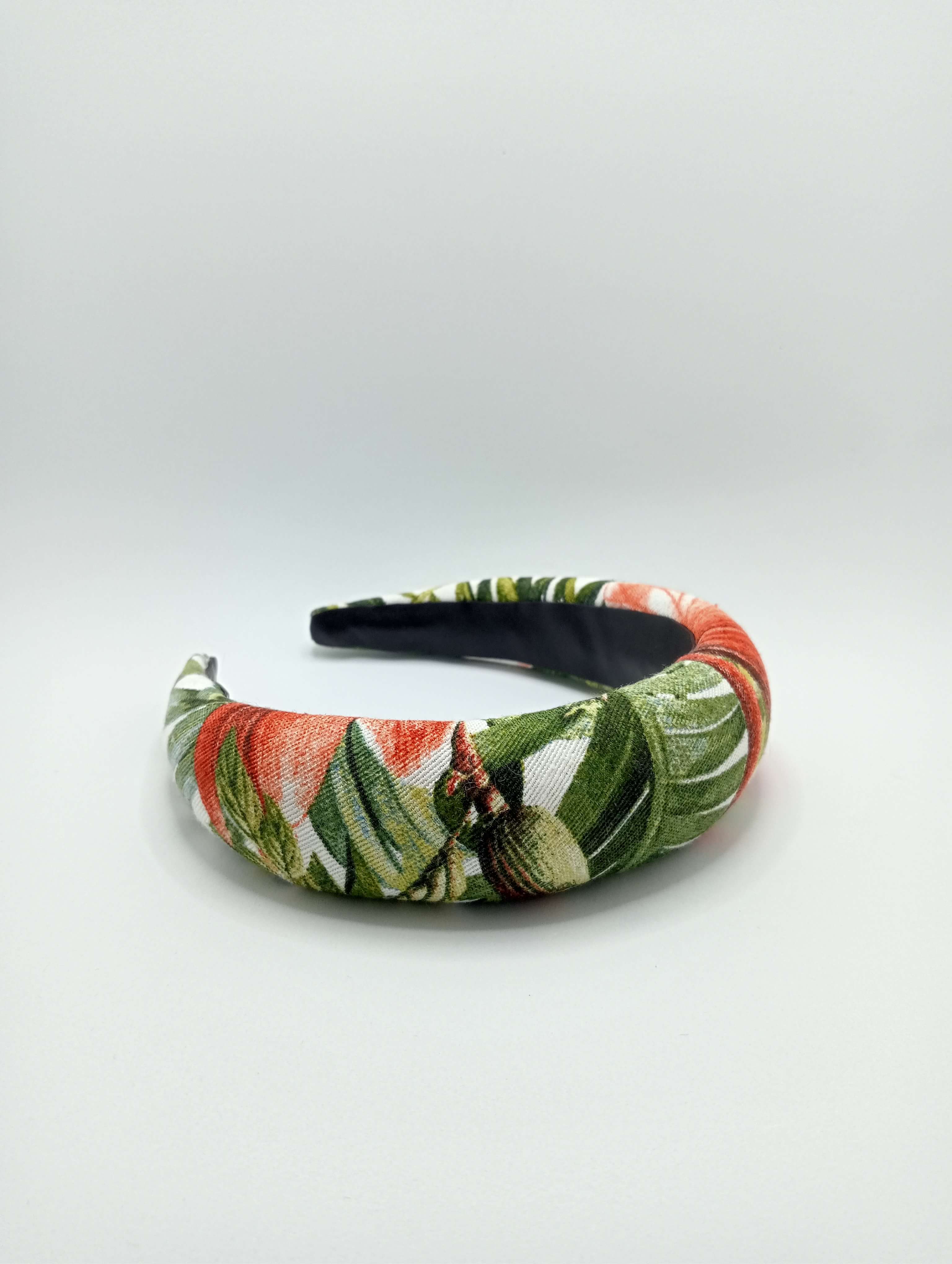 Diadema plana y sin costuras, confeccionada a mano sobre una estructura de entretela de sombrererÃa de 7 cm en la parte de mayor anchura y 9 cm entre las puntas; forrada, por la cara externa, con un micado de poliéster y seda pura, estampado con lunares negros y unas preciosas flores de color amarillo canario sobre un fondo del color del marfil; y, por la cara interna, con cuero sintético. Es lujosa y lustrosa, aunque muy ligera, y carece de la estructura tan rÃgida y robusta que caracteriza otras diademas del catálogo.