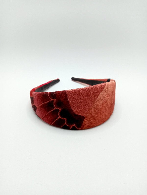 Diadema forrada con un tejido de algodón estampado con el ala de una garza en tonos rosas y fucsias