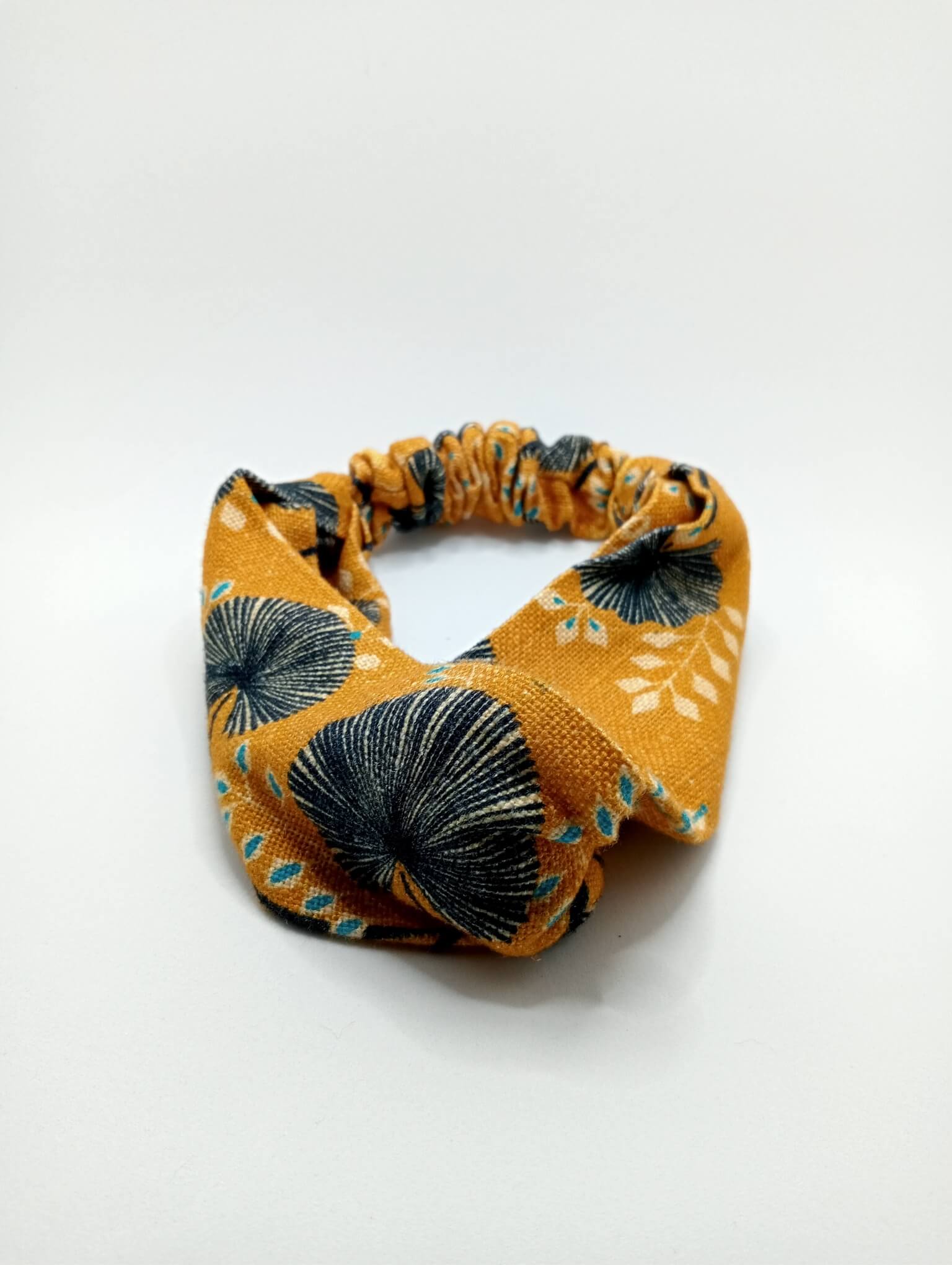 Turbante elaborado con un tejido de viscosa y lino de Pondichery de color amarillo mostaza, estampado con hojas y flores de color negro, beige y verde esmeralda